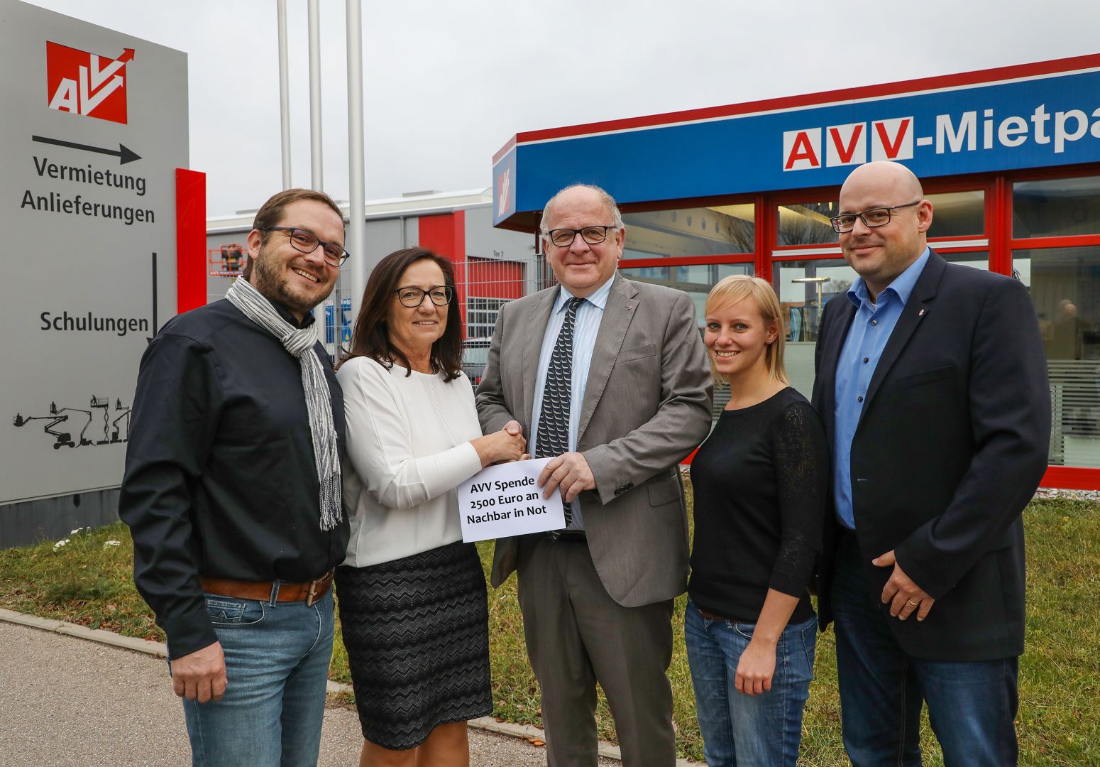 Die AVV Arbeitsbühnen-Vertriebs- und Vermietungs GmbH spendet in diesem Jahr 2.500,00 € an die Unterstiftung "Nachbar in Not" der Schwäbisch Haller Bürgerstiftung. Trotz des umfangreichen Hilfsnetzes von Staat und Wohlfahrtsorganisationen rutschen immer wieder Menschen durch das Raster des Sozialsystems, weil ihre Notlage keiner "Norm" entspricht. Genau in diesen Fällen springt "Nachbar in Not" ein und leistet finanzielle Soforthilfe.